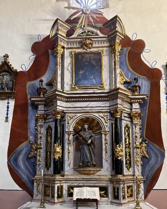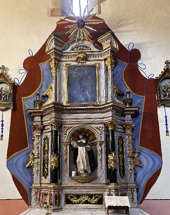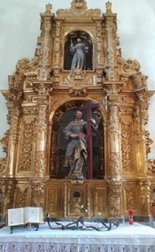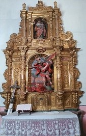 Frente a la puerta de entrada a la iglesia se conserva un magnífico retablo del siglo XVII, realizado en 1671. Se trata de un retablo pre – churrigueresco de cuerpo y ático, con calle única. Utiliza dobles columnas serpeadas y remates de pirámides herrerianas. Destaca la bella factura de la policromía, característica del siglo XVII.